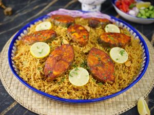 -In a serving platter, add mandi rice, baked fish, garnish with lemon slices, give a coal smoke & serve with prepared mandi sauce & salad!
