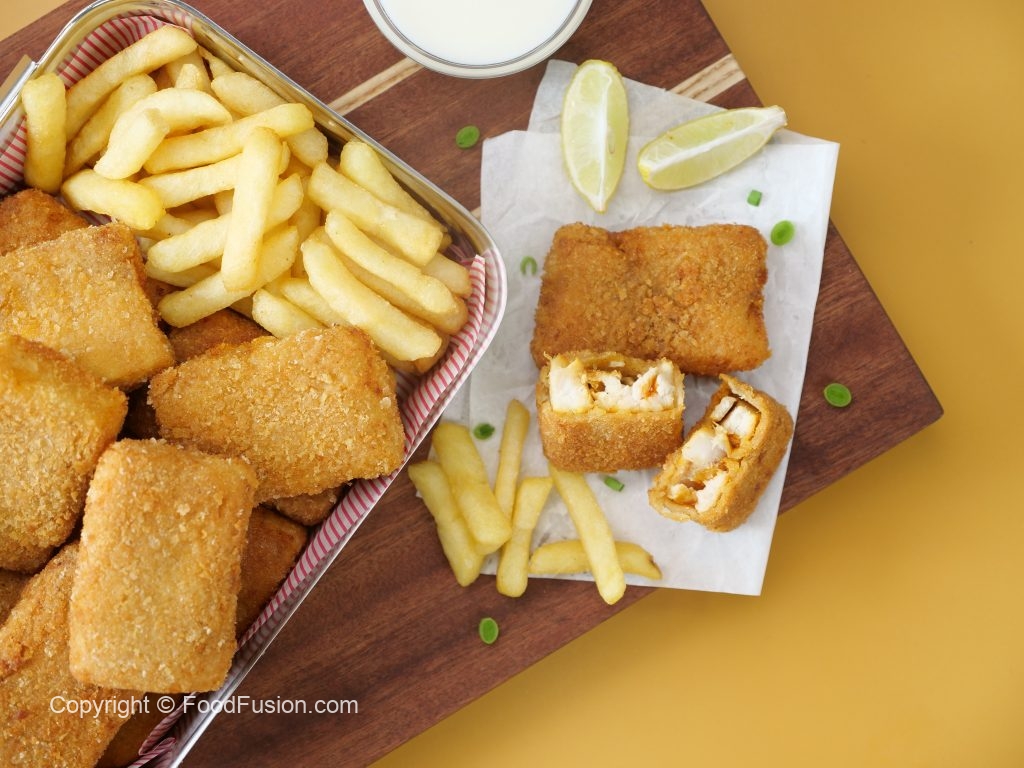 Coat frozen fish nuggets with all-purpose flour than dip into liquid flour mixture & coat with breadcrumbs (makes 26-28).