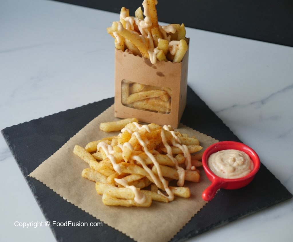 Fries per mayo garlic sauce drizzle ker ka serve karein!