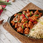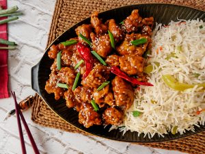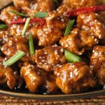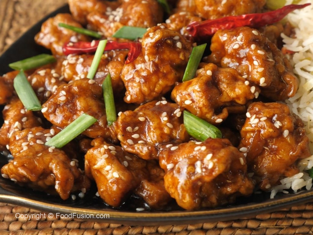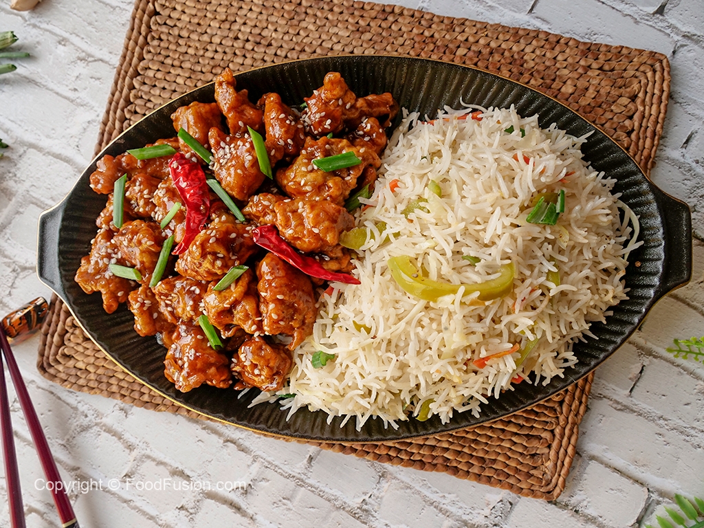 Garnish with sesame seeds,green onion leaves & serve with fried rice.