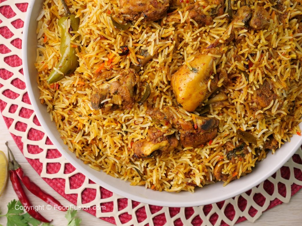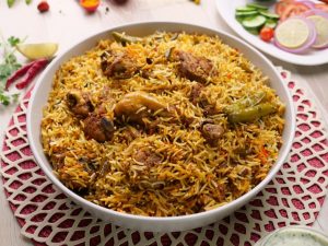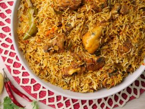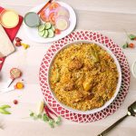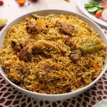 -Add mint leaves,fresh coriander,green chillies,boiled rice,mint leaves,fresh coriander,green chillies, fried onion,orange food color & desi ghee,cover with kitchen cloth & lid and steam cook on low flame for 10-12 minutes.