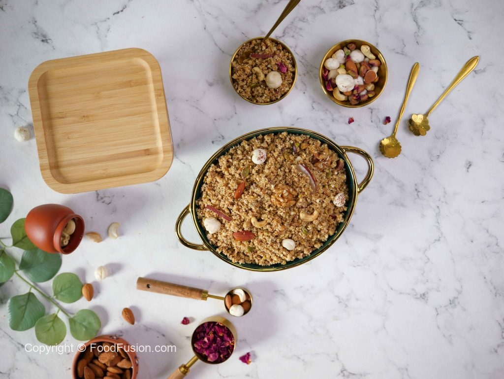 -Phir se ghee melt karein aur almonds, pistachios, cashews, walnuts aur dried coconut add karke low flame par 3-4 minutes fry karein.