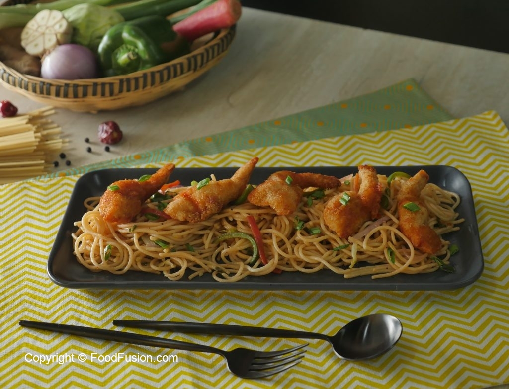 Serve Hakka noodles with fried shrimps and sprinkle spring onion green for garnishing.