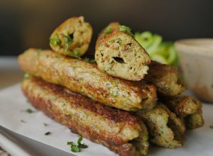 Haathon ko pani sa geela karein aur mixture (55g) ko la ker metal skewers per ek jaisay sizes ka kabab tayyar ker lein (makes 12).
