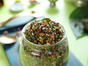 Take out in a bowl,add mint leaves,fresh coriander,red chilli,green onion leaves & mix well.