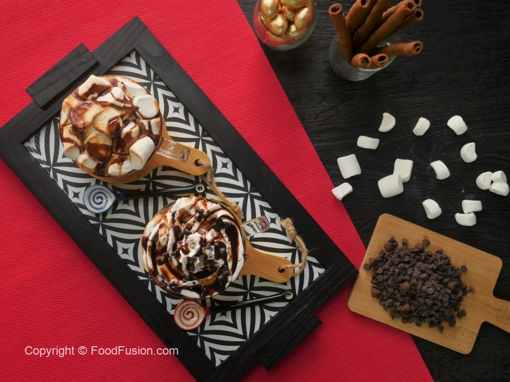 Serving cup mein nutella hot chocolate,whipped cream,chocolate chips,chocolate syrup aur cocoa powder dal ker serve karein.