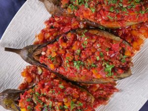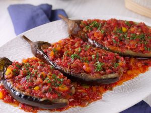 -Peel eggplants alternatively from the skin lengthways & prick with fork (don’t remove the head).