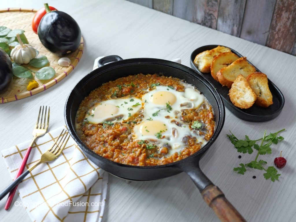 -Insert skewer & fire roast eggplant over medium flame until skin is charred,remove charred skin,chop well & set aside.