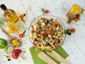 -Red bell pepper,kheera,black olives,green olives,cherry tomatoes,shimla mirch,beef pepperoni, pyaz,cottage cheese aur fresh parsley dal ker ache tarhan toss ker lein.
