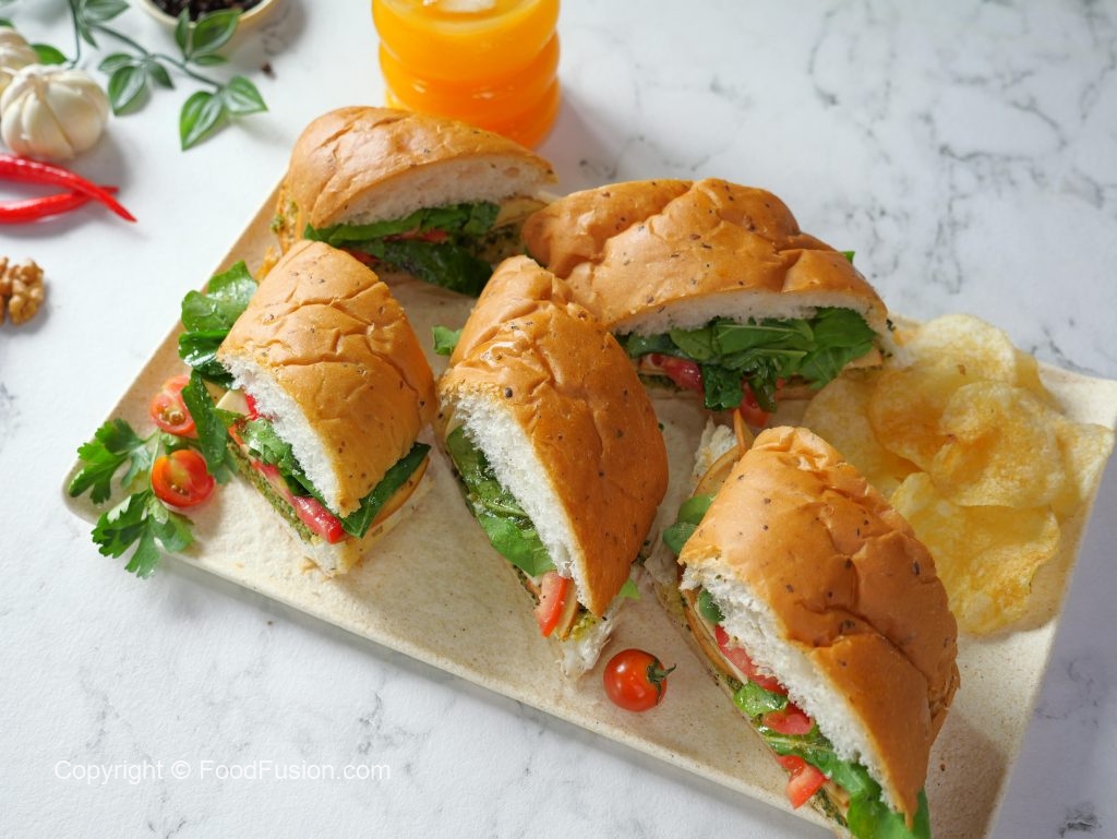 -Add & spread prepared pesto,mortadella slices,cheese slices,tomato slices,rocket leaves,olive oil,pink salt,black pepper powder & cover with top.