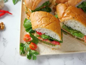 -Tayyar pesto,mortadella slices,cheese slices,tamatar,rocket leaves,olive oil,pink salt aur kali mirch powder dal dein aur top bread se cover karein.