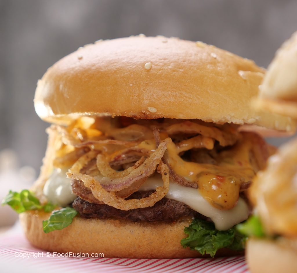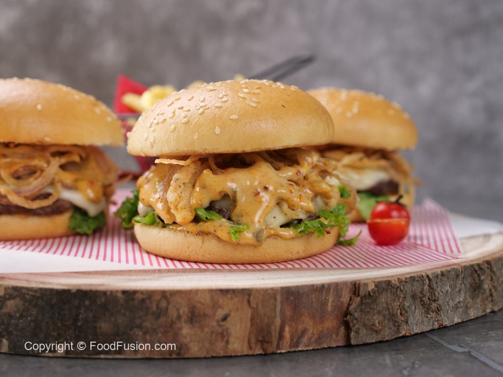 -On burger bun,add & spread jalapeno burger sauce,lettuce leaves,cheese patty,onion rings,jalapeno burger sauce & top with another bun to make a burger (makes 5).