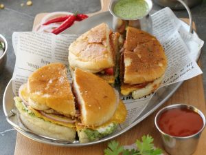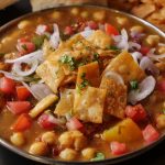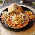 -On a serving plate,add khathiawari cholay,prepared hari chutney,tomato,chaat masala,red chilli crushed,onion,papri,fresh coriander & serve with pav buns!