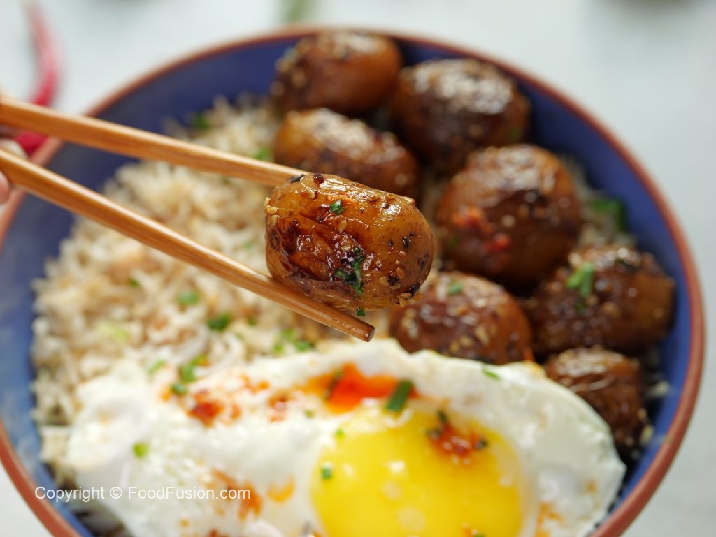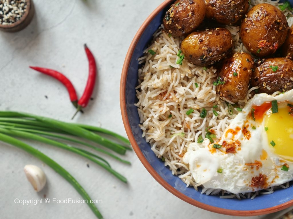 -In a serving bowl,add korean rice,korean potatoes & fried egg.