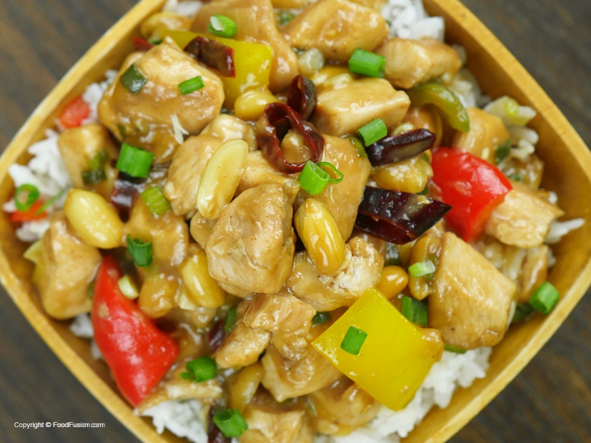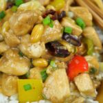 In a wok, add oil and saute dried red chilies, ginger, garlic. Add white part of green onion and bell pepper, saute and add chicken and sauce.