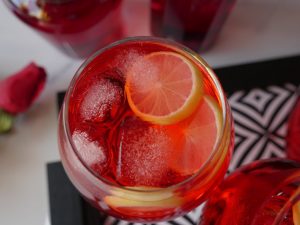 In serving glass,add ice cubes,lemon slices and prepared laal sharbart & serve!