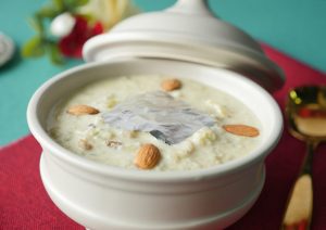 Garnish with edible silver leaf,almond & serve chilled!