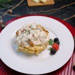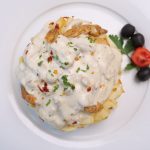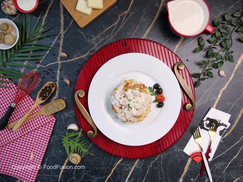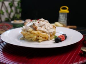 -In baking pan,add potato fries,creamy alfredo sauce,mozzarella cheese,potato fries,mozzarella cheese,red chilli crushed & fresh parsley.