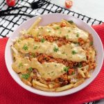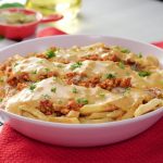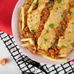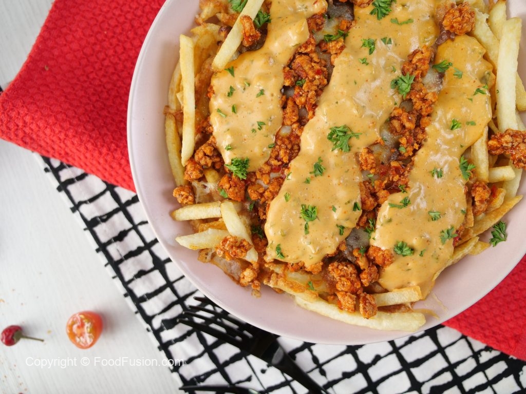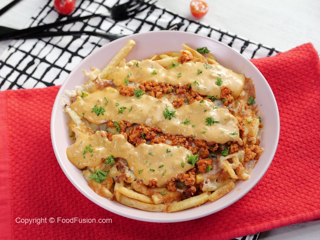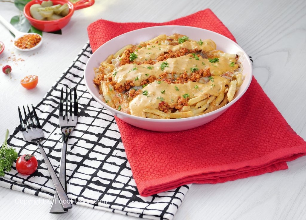 -On a serving dish,add potato fries,prepared hot chicken filling,caramelized onion,cheddar cheese, mozzarella cheese & air fry at 180°C until cheese melts (3-4 minutes).
