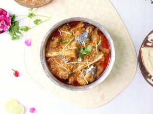 -On a muslin cloth,add black cardamom,cinnamon sticks,cloves,mace,nutmeg,cumin seeds,dried rose petals & tie to make a potli (bouquet garni) & add it in pot.