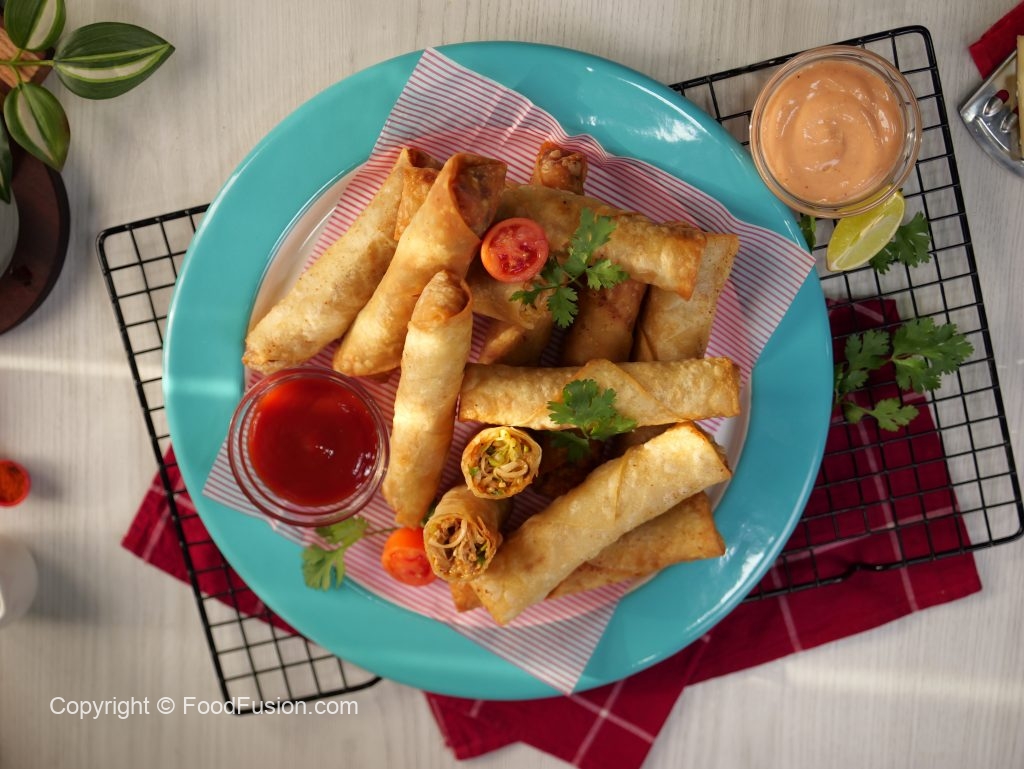 -Cut roll sheets diagonally,making a triangular shape,take one triangle sheet,add prepared filling,apply flour slurry,fold & roll up (makes 18-20).