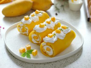 -Place mango chunks & roll up to make a swiss roll.