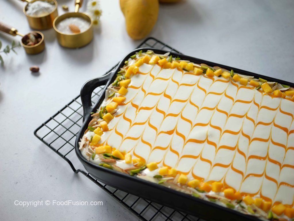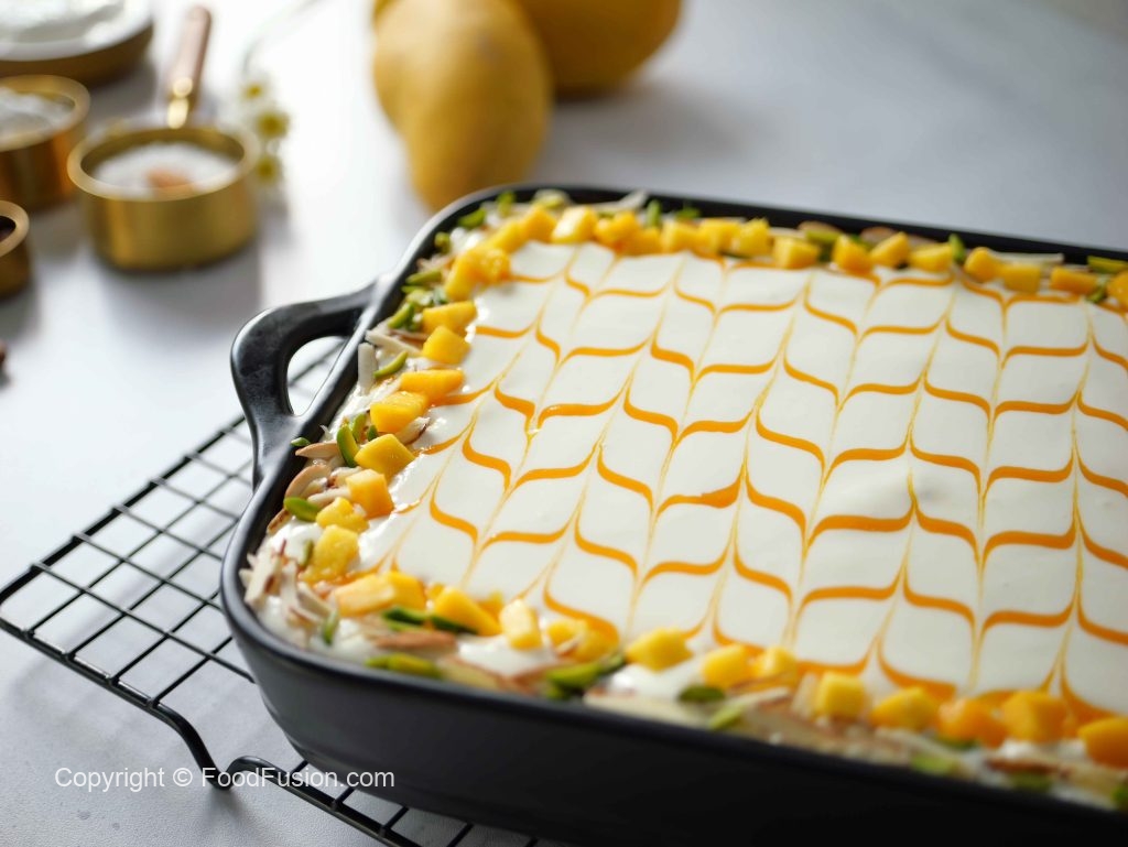 -Add & spread prepared cream mixture & garnish with prepared mango puree,almonds,pistachios & mango cubes.