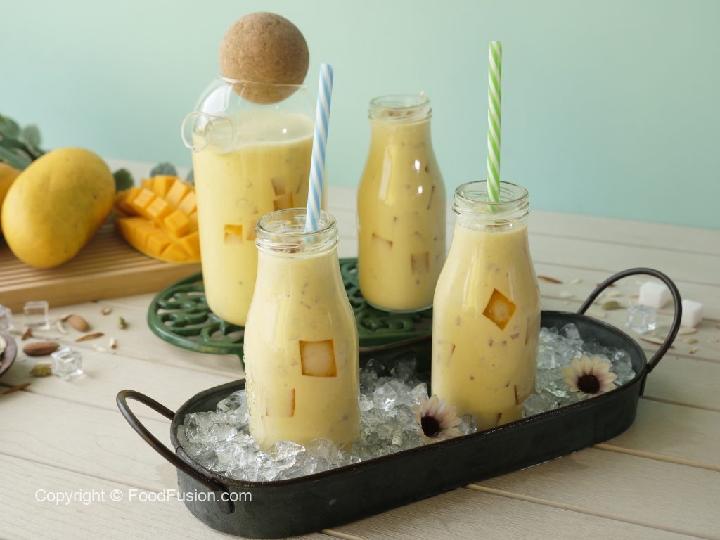 Serving bottle mein mango jelly cubes,tayyar doodh aur badam dal dein.