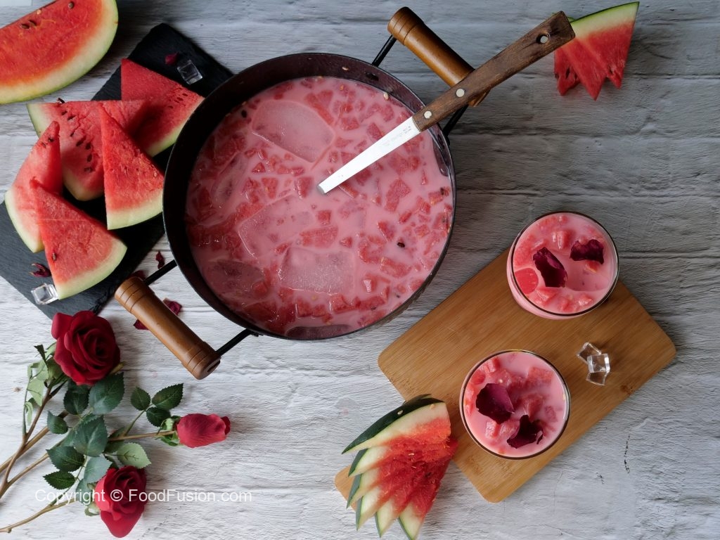 A famous street style Watermelon Drink, known as Mohabbat ka Sharbat. So quickly make this sharbat and spread some love with people around you. #FoodFusion #HappyCookingToYou #FoodFusion #SummerDrinks