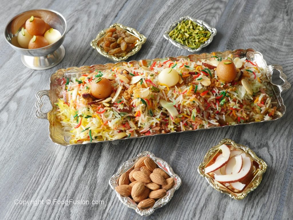 Fried khoya,green colored chawal,red colored chawal aur yellow colored chawal dal dein.