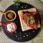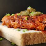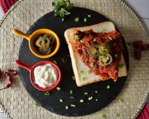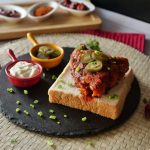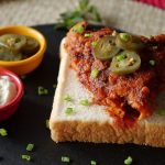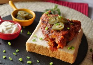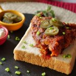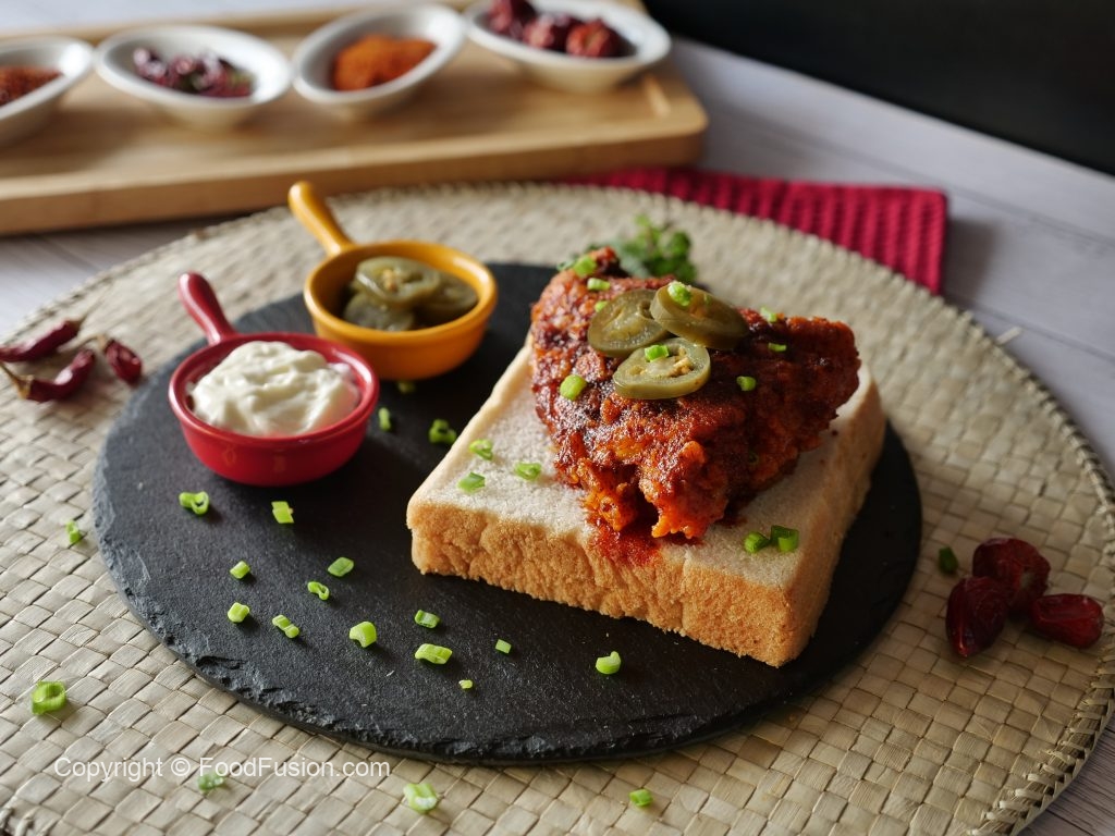 On bread slices,place fried chicken piece,jalapenos slice,sprinkle green onion leaves & serve!
