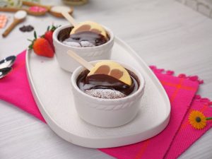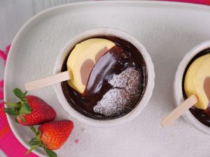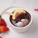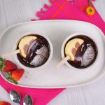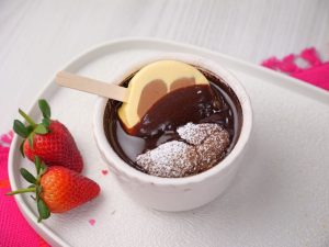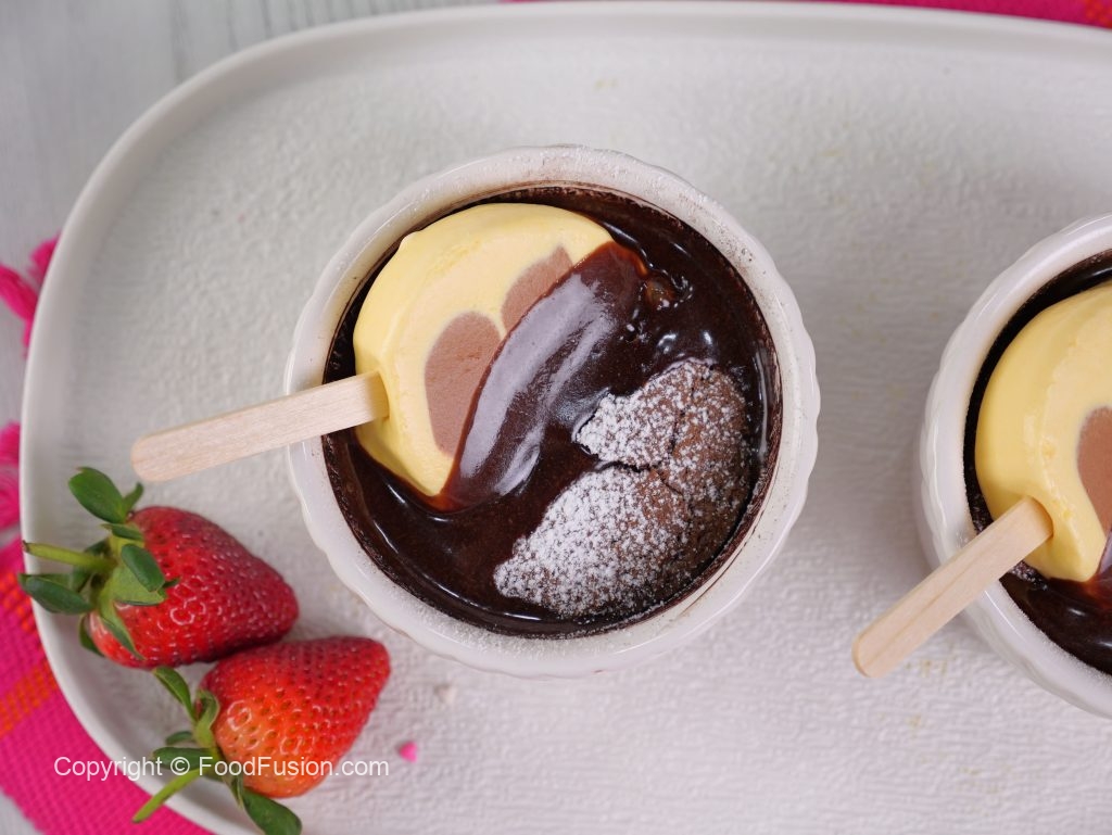 -Pour prepared batter in ramekins & add 1 tbs of prepared chocolate ganache inside the batter,cover with cling film & can be stored in freezer for up to 1 month,just thaw for 10 minutes before baking.