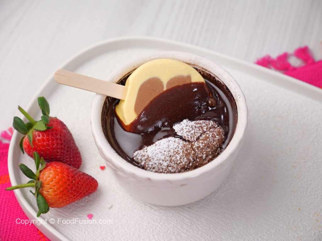 -Grease ramekin (4oz) with butter,add cocoa powder,dust excess & set aside.