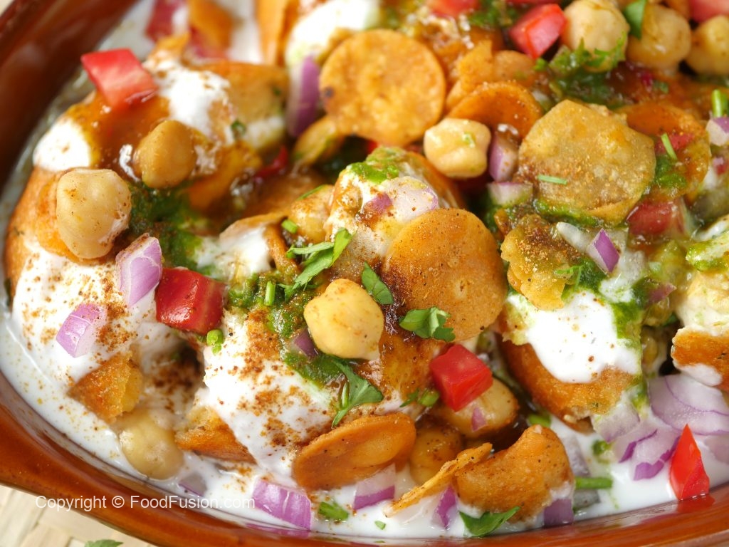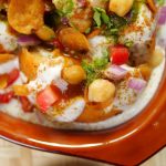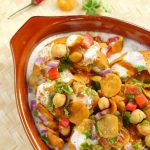 -Add yogurt,papri,prepared imli chutney,green chutney,tomato,onion,chickpeas & papri.