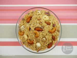Bowl mein sooji mixture,coarsely ground fried nuts,char magaz & kishmish aur pisi huee cheeni dal ker ache tarhan mix ker lein.