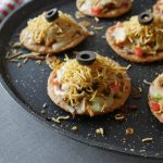 On papri,add & spread pizza sauce,cooked chicken,capsicum,onion,tomato,cheddar cheese, mozzarella cheese,red chilli crushed,dried oregano,cover & cook on low flame until cheese melts (2-3 minutes).