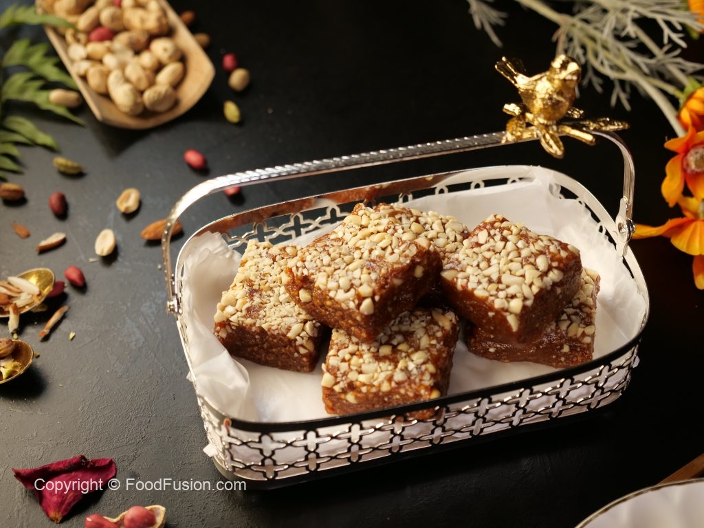 -On a greased mold,add peanuts,prepared barfi & spread evenly.