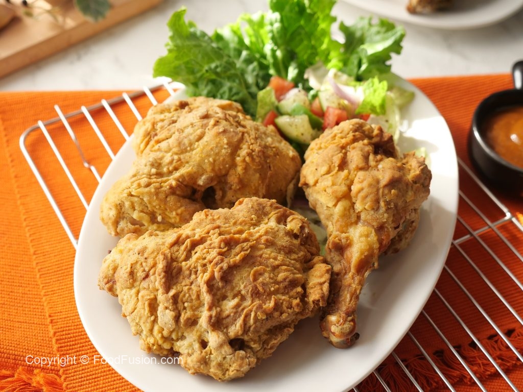 Crispy air fried chicken ko sauce & salad ka sath serve karen.