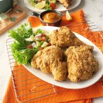 Serve crispy air fried chicken with sauce & salad.