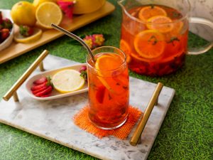 -Ab ek jug mein ice cubes, prepared lemonade, peach, red grapes, apple, lemon, orange juice, pineapple juice, sparkling water aur omore traffic light daal kar mix karen.