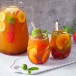 -In a jug,add ice cubes,prepared lemonade,peach,red grapes,apple,lemon,orange juice,pineapple juice, sparkling water,omore traffic light & mix well.