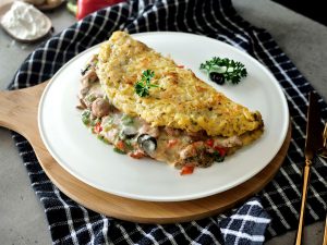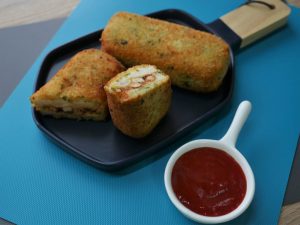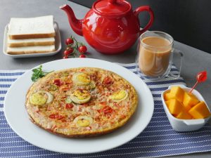 -Cut bread roll in 1 inch cubes & add in a baking pan (10x10 inches), pour prepared egg mixture.