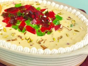-Ek bowl mein anday, cream, caster sugar, elaichi powder, pink namak, doodh, vanilla essence aur pighla hua butter dalein, achi tarah whisk karen aur side par rakh den.