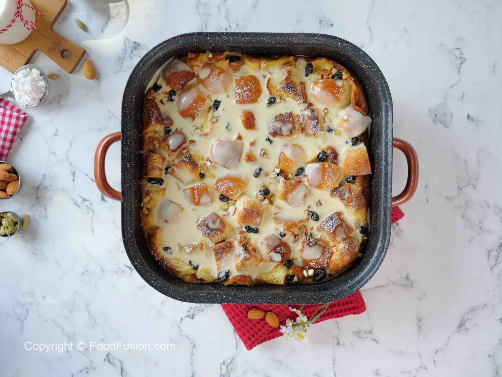 -Pour vanilla custard sauce on bread pudding, garnish with icing sugar & serve!
