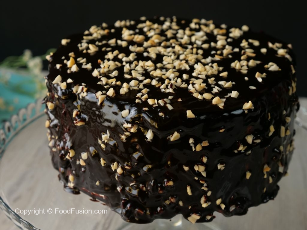 Remaining warm ganache ko cake ka upper dal dein aur peanuts dal dein.