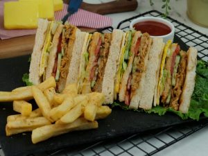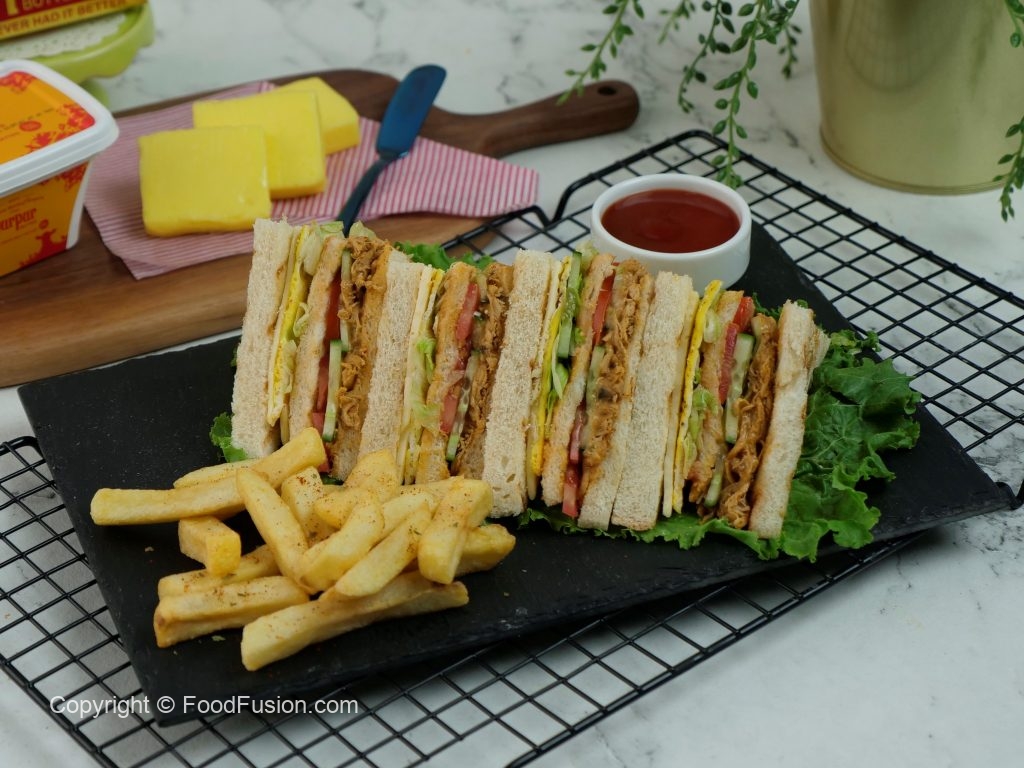 Bread slice mein pulled chicken dal ker pheela lein,kheera slices aur tamatar slices dal dein, another toasted bread slice rakh dein,tomato ketchup,ice berg,tayyar anda aur chedder cheese slice rakh ker upper sa toasted bread slice rakh dein (makes 4-5 sandwiches).