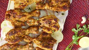 -Bowl mein dahi,cream,anday ki zardi,adra lehsan paste,lal mirch powder,zeera powder,zeera powder,kaju powder,dhania powder,kala zeera powder,zafran,pink salt,lal mirch crushed aur garam masala powder dal ker ache tarhan whisk ker lein.