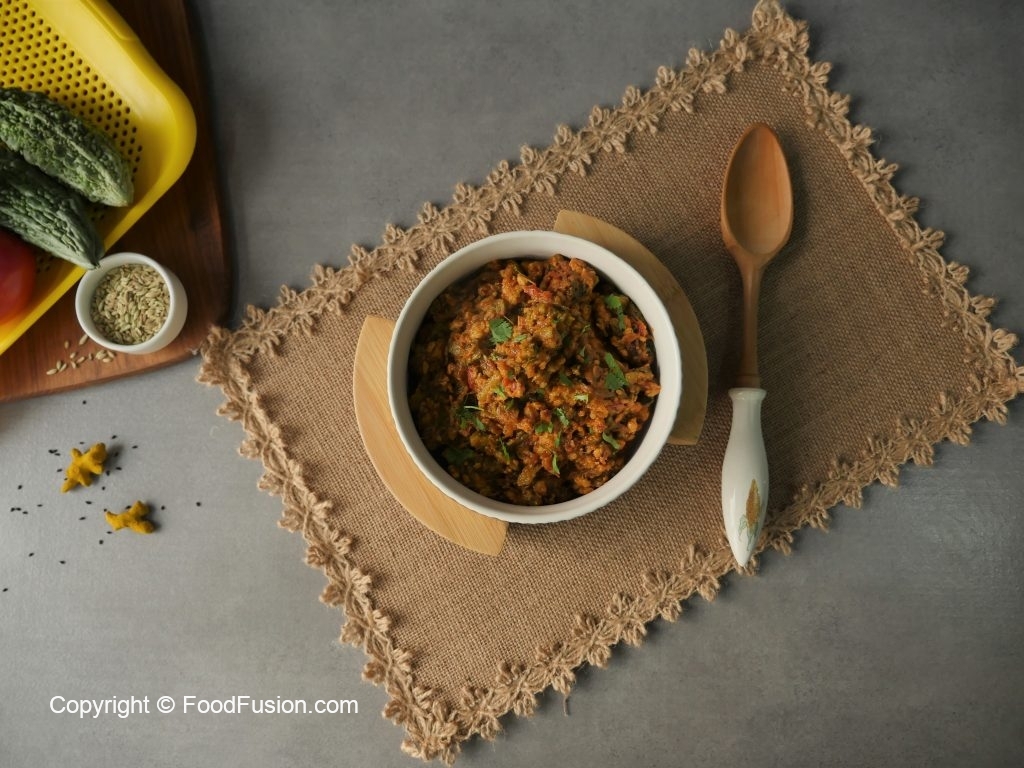 Now add fried bitter gourd and mix well,cover and cook on low flame for 8-10 minutes then cook on high flame until oil separates.