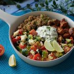 On a serving dish,add quinoa,greek salad,prepared chicken & tzatziki sauce.
