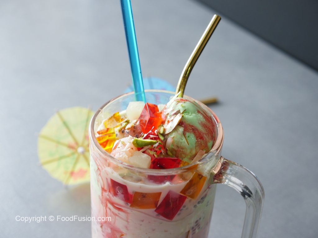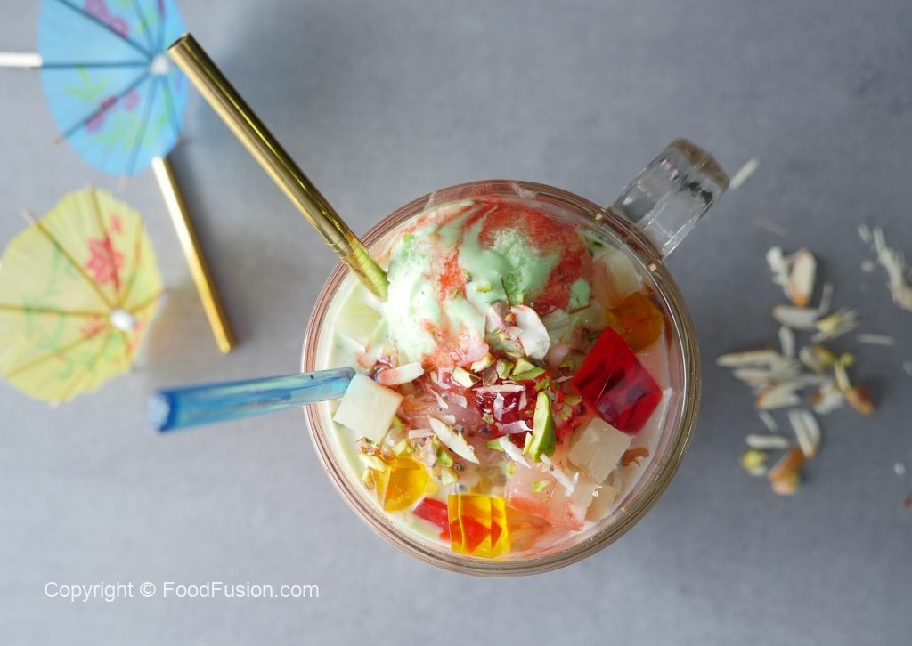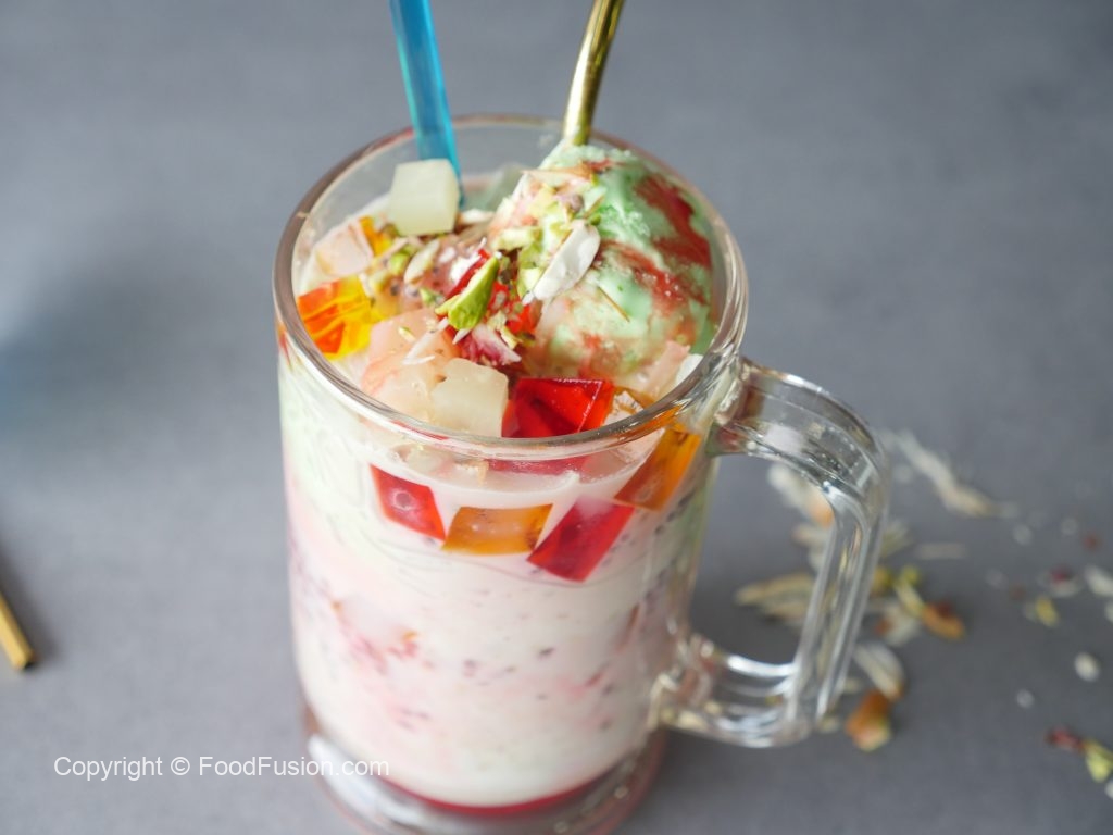 Serving glass mein falooda sev,tukh malanga,lal sharbat,tayyar rabri doodh,yellow jelly,red jelly,pista ice cream scoop,falooda sev,tukh malanga,pineapple chunks,red jelly,yellow jelly,lal sharbat,badam aur pista dal ker serve karein.